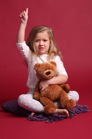 クマ 小さな花嫁 幸せな子供時代 小さな女の子 幸せな家族 ウェディング ドレスで赤ちゃん金髪少女 分離 スタジオ 白の背景で赤ちゃんドレス結婚式の女性 の写真素材 画像素材 Image